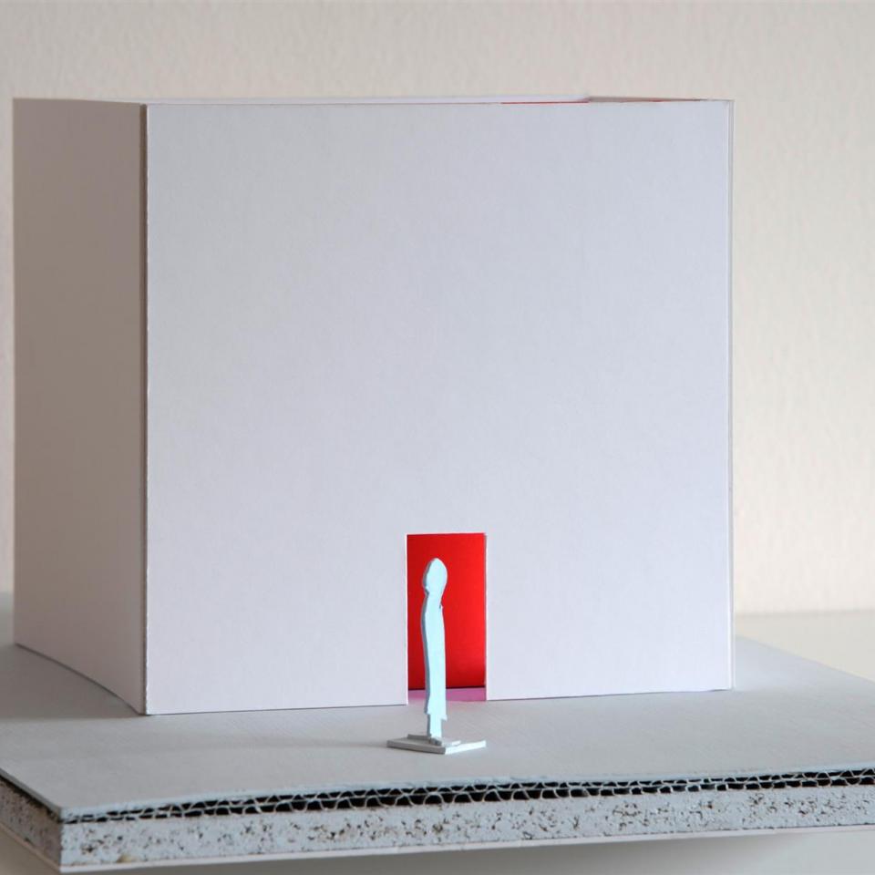 Stellen Sie sich einen schneeweißen Würfel vor. Er hat eine Seitenlänge von fünf Metern und steht in einer großen, leeren weißen Halle.