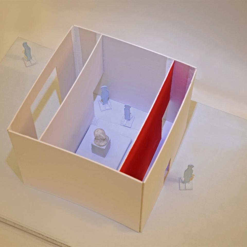 Um ins Innere zu kommen, müssen Sie sich folglich bücken. Die rote Farbe im schmalen Raum macht Sie aggressiv. Sie gehen durch den schmalen Gang und treten in einen weißen Raum und da steht im Zentrum vor Ihnen auf einem Podest eine Büste. Es ist ein Alukopf des Diktators, der zum Land passt, in dem Sie gepeinigt wurden. Wut!