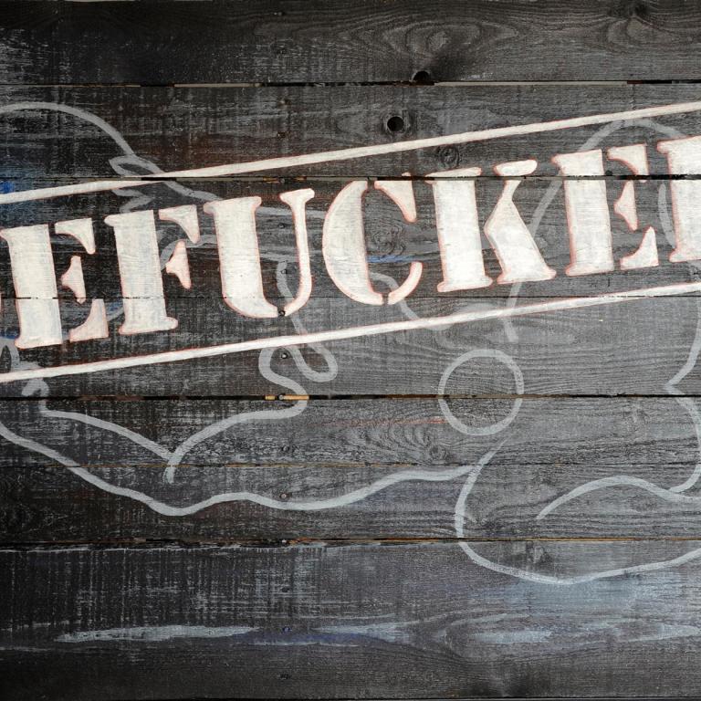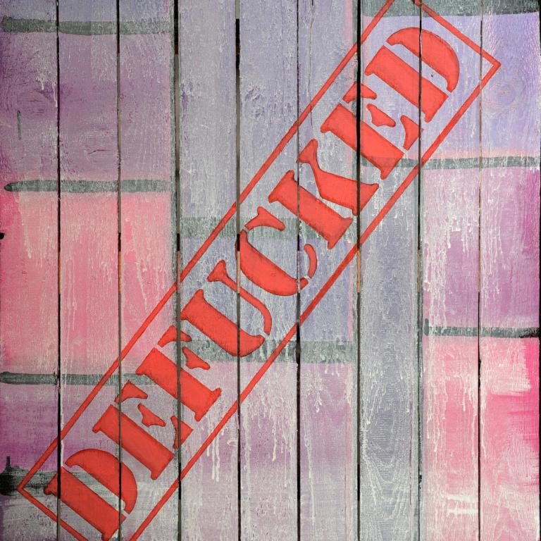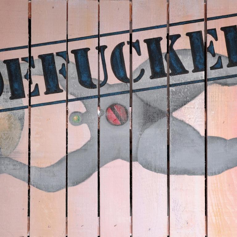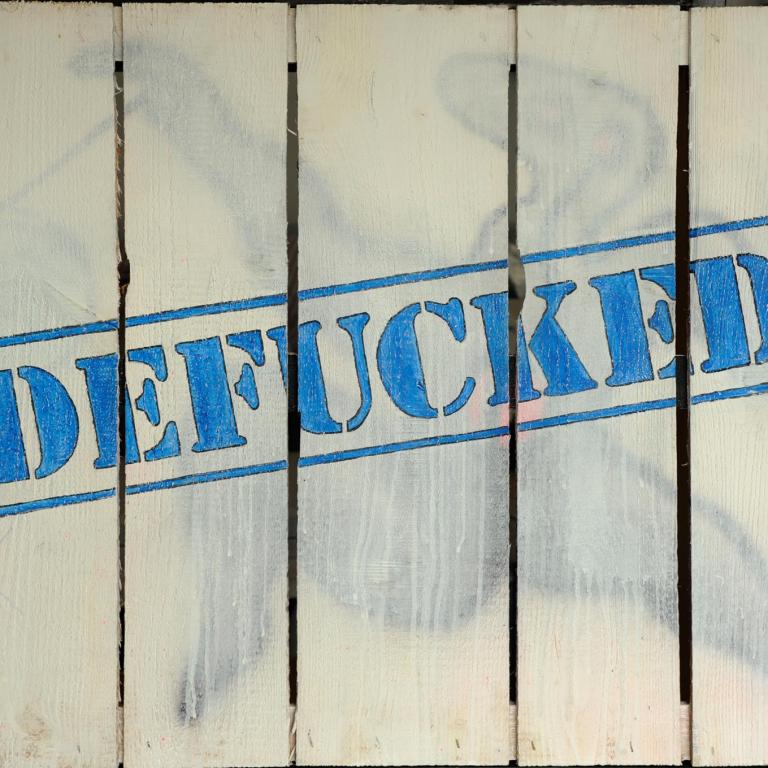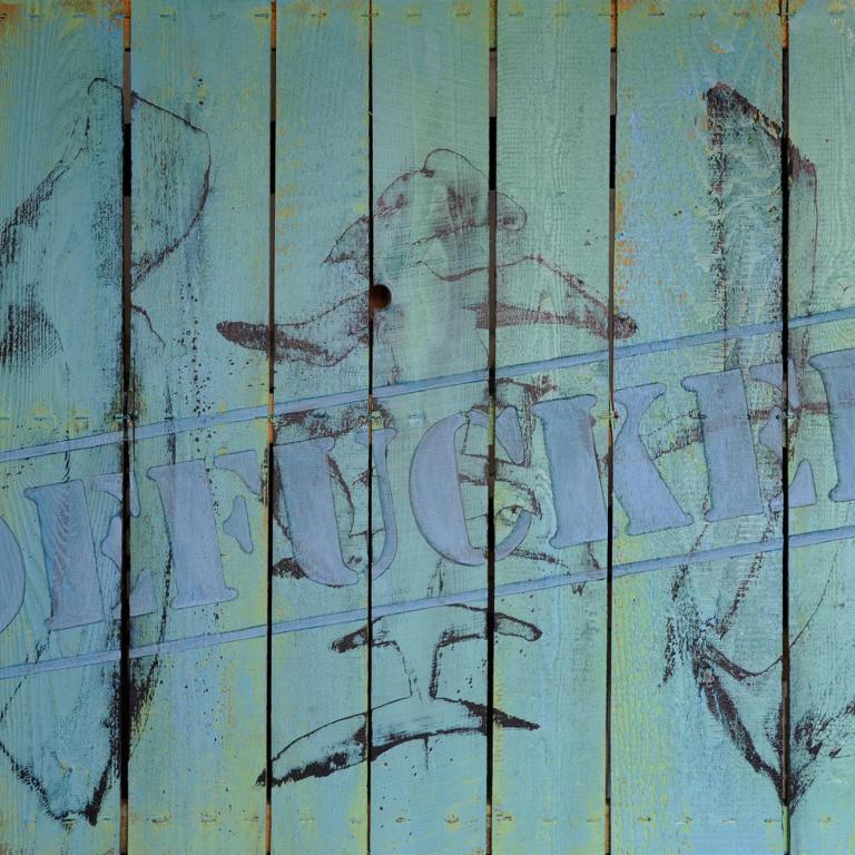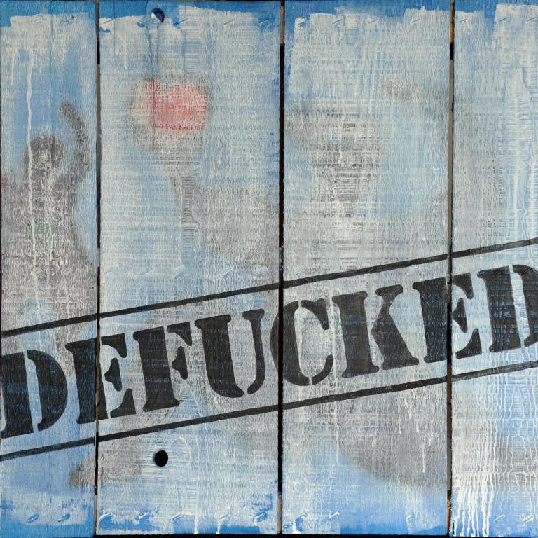 Bilder, die mir nicht oder nicht mehr gefallen (fucked-up paintings), habe ich weiß, nicht deckend übermalt und mit DEFUCKED beschriftet.